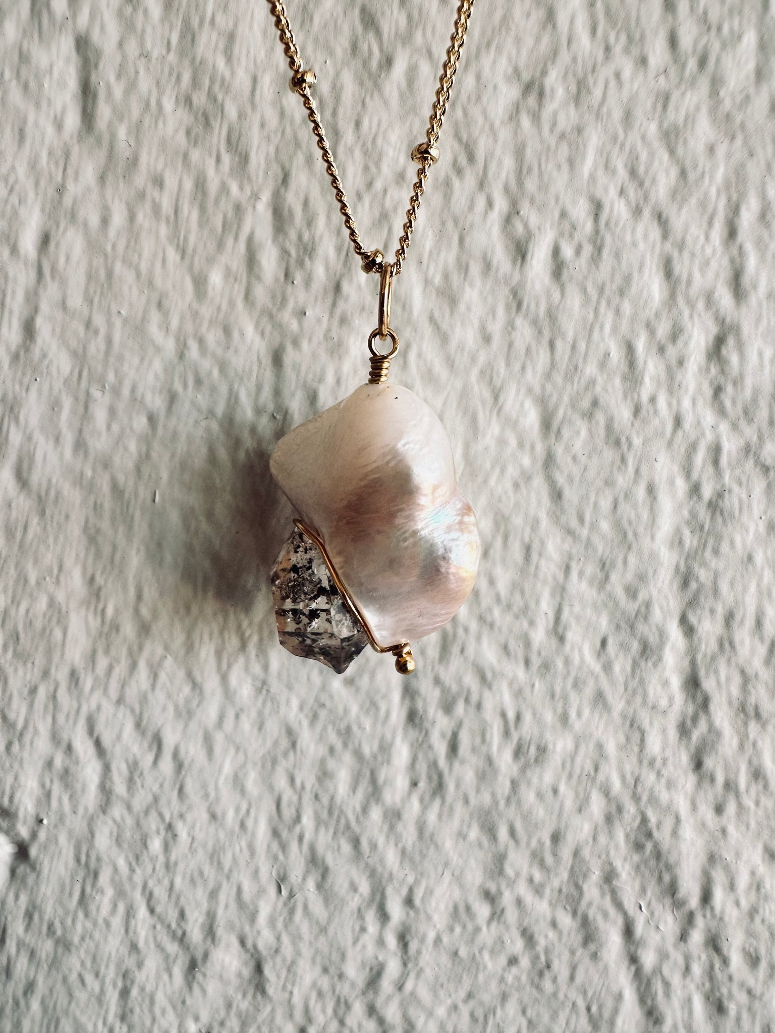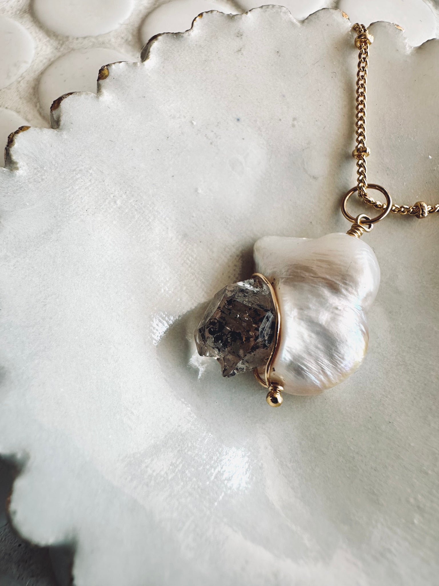 Featuring a 12mm Herkimer Diamond adjoining a 20mm Sawtooth Pearl, delicately wire wrapped with 14k gold filled wire and hardware.